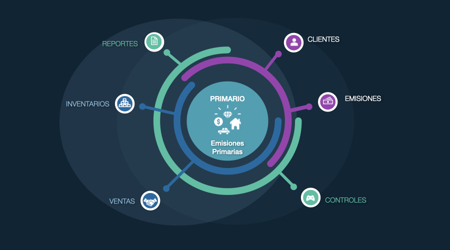 Primario permite controlar las nuevas emisiones de títulos de renta fija o variable, que se realiza en el mercado de valores, desde el inicio de la oferta, hasta la asignación definitiva por parte del emisor y liquidación del proceso. Las órdenes incluyen los datos del cliente, condiciones de financiamiento, instrucciones, re-compras, etc. Es un Container que permite la adaptación a los procesos específicos de títulos, basados en cestas o composición de títulos de diferente naturaleza.