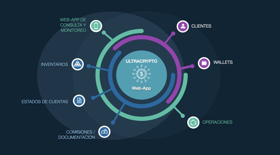 Es una aplicación dedicada a la administración de wallets de criptomoneda y efectivo para clientes. Este Container permite registrar operaciones con Criptomonedas, y ejecutar procesos de Back-Office . Estos procesos incluyen registro de operaciones P2P, compra y venta con moneda feat, carga de precio de forma masiva, traspasos de inventarios, cuentas maestros e individuales.